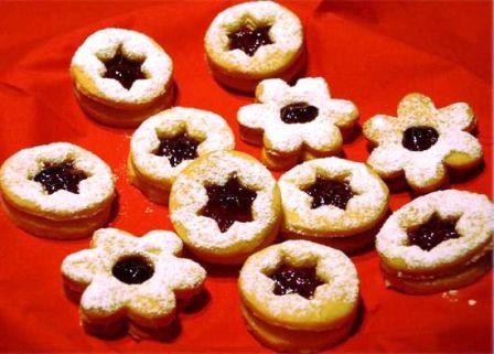 Die Ringe mit Puderzucker bestäuben - die Plätzchen mit rotem Gelee bestreichen und zusammensetzen.Fertig sind die "Roten Spitzbuben"!