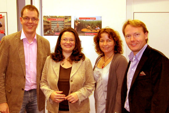 Über die Nominierung zum Wilhelm-Dröscher-Preis 2011 freuen sich die Mitglieder des SPD-Arbeitskreises Labertal. Generalsekretärin Andrea Nahles, die mit in der Jury sitzt, diskutierte in München mit den niederbayerischen Bewerbern über ihre Bewerbung. In fünf Kategorien wird dieser Preis vergeben, der 1982 auf Anregung des SPD-Vorsitzenden Willy Brandt und des Bundesgeschäftsführers Peter Glotz ins Leben gerufen wurde. Damit wird beispielhaftes ehrenamtliches Engagement in der SPD ausgezeichnet. Mit der Namensgebung wird die Lebensleistung des ehemaligen SPD-Schatzmeisters Wilhelm Dröscher gewürdigt, der 1977 auf dem Hamburger Parteitag starb. Dem Kuratorium des mit 15.000 Euro dotierten Preises sitzt Bundesministerin a.D. Heidemarie Wieczorek-Zeul vor.