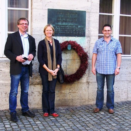 Madlen Melzer, Schierlings SPD-Ortsvorsitzende und Marktrat Armin Buchner zusammen mit Uwe Lehmann vom Bundespresseamt an der Hinrichtungsstätte der Widerstandskämpfer um Oberst i.G. Claus Schenk Graf von Stauffenberg.