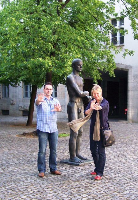 Madlen Melzer und Armin Buchner vor der Bronzefigur eines jungen Mannes mit gebundenen Händen.