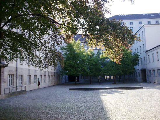 Blick in den Ehrenhof des Bendlerblocks: Der Gebäudekomplex hatte den 2. Weltkrieg relativ unbeschadet überstanden und beherbergt jetzt u.a. die Gedenkstätte Deutscher Widerstand. Links an der Gebäudemauer die Gedenktafel an der Hinrichtungsstätte der Widerstandskämpfer des 20. Juli 1944.